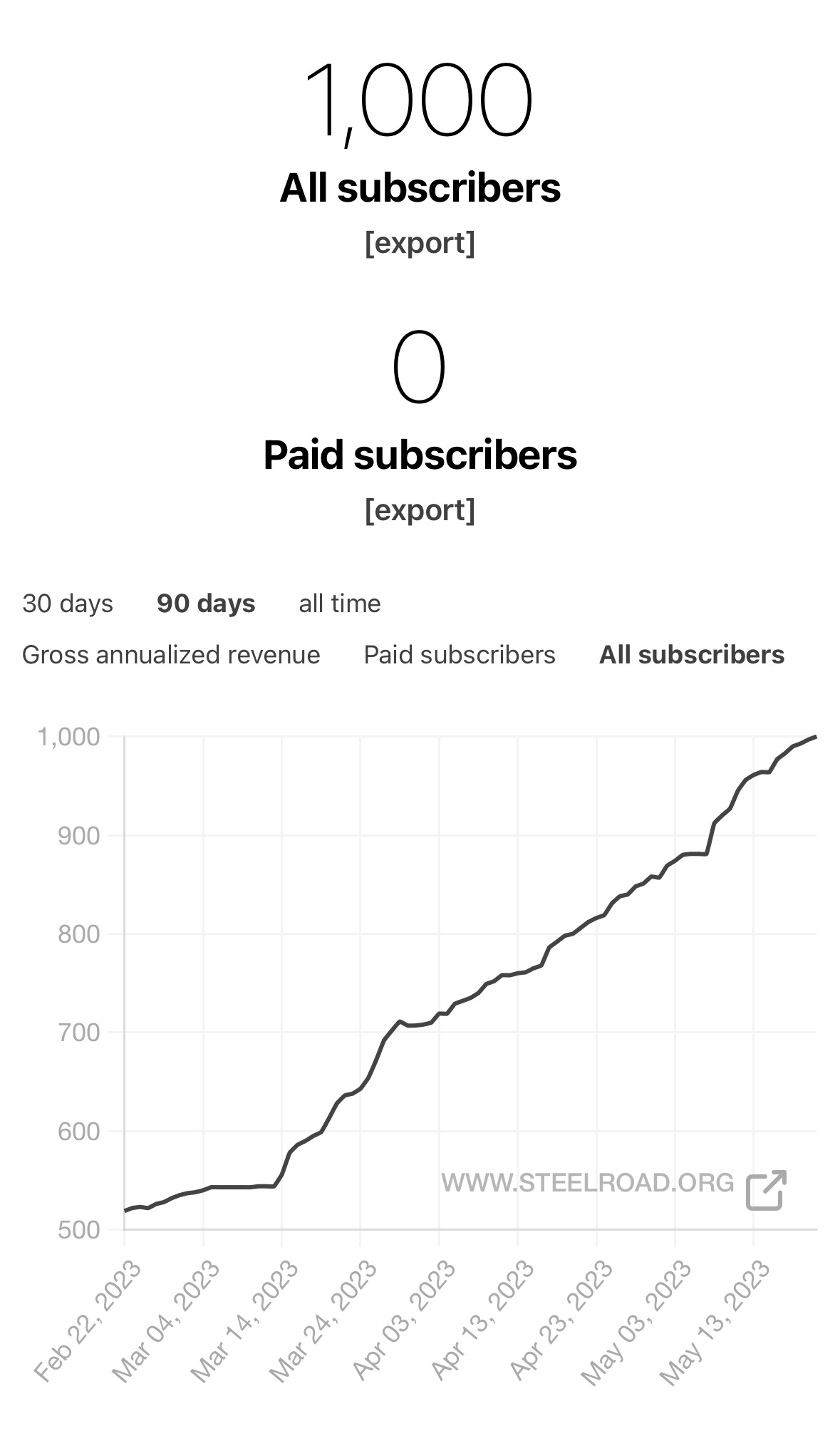 Hi all, Matt Bidstrup here. I am the founder of The Steel Road. We recently hit a really awesome milestone that feels like a big deal. After about 5 months of active newsletter writing we have reached 1,000 subscribers!