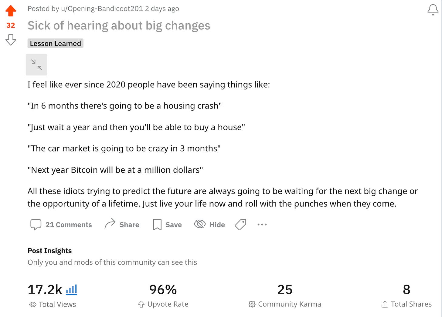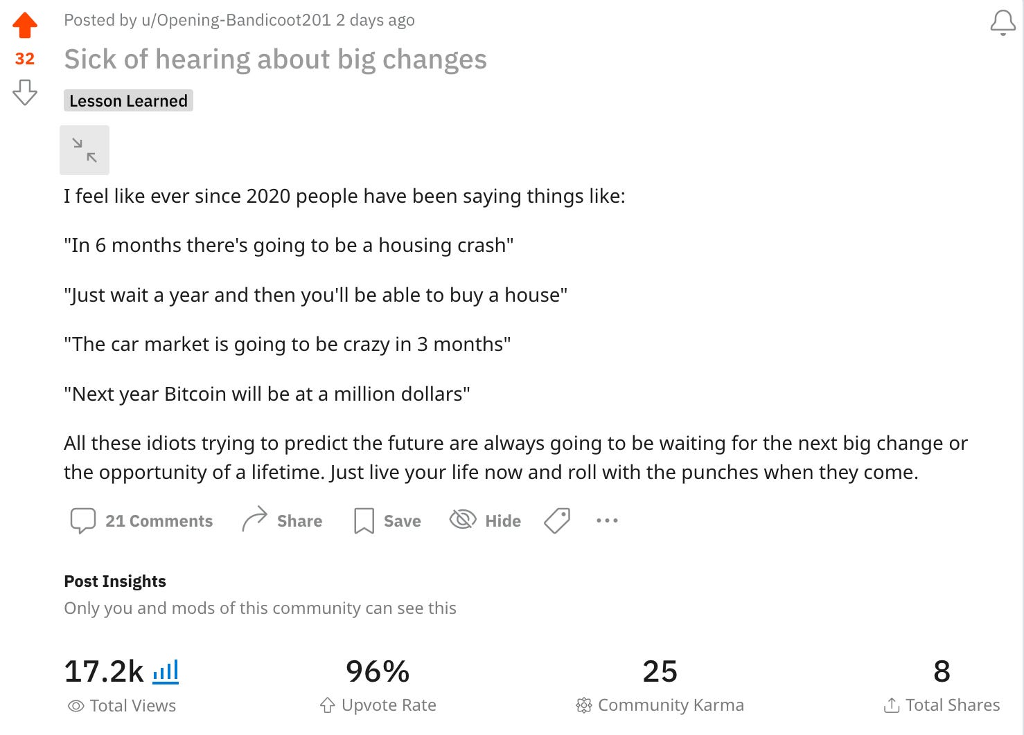 Some people took offense, others tried to convince me that the housing market is actually going to crash this year. Most of them missed the point of the post.
