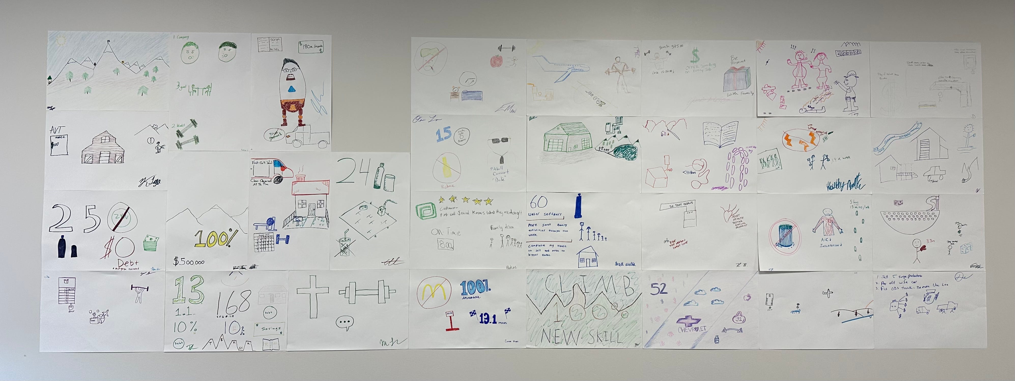 Before the meeting I set up sheets of paper with markers and crayons spread out. Each person drew out their goals in a “mural”. As you can imagine, a bunch of 30-50 year old blue collar men were not that thrilled with the task.
