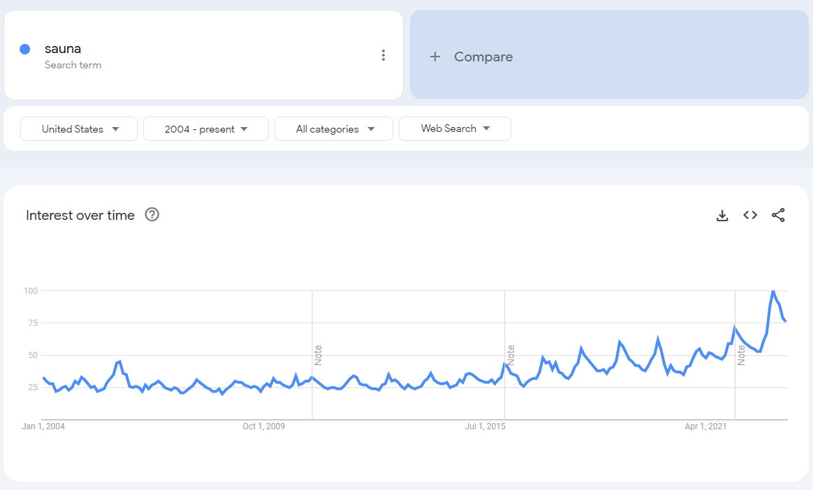This sauna craze has increasingly spread to the United States. Google Trends data shows a steady rise in searches with the keyword sauna, with the peak in January 2023.
